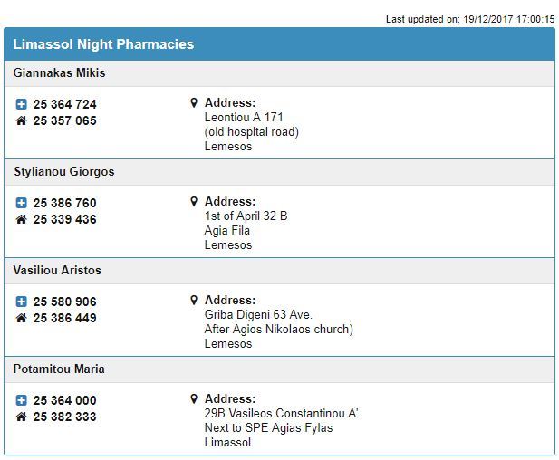 Каждый день дежурными назначаются разные аптеки, поэтому стоит позвонить по номеру 90901405 и уточнить информацию либо же дойти до любой ближайшей аптеки, на её двери будет табличка со списком дежурных аптек. Вот на этом сайте есть список дежурных аптек, он обновляется каждый день. Также в Лимассоле есть несколько русских аптек. И помните, если вдруг вам стало очень плохо, возможно, стоит ехать сразу в больницу. В таком случае не забудьте взять свою страховку.