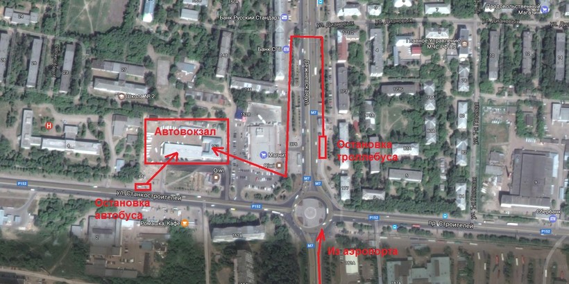 Традиционно перед аэропортом располагается парковка, слева находится остановка общественного транспорта, где останавливается автобус №133 и троллейбус №11. Эти два маршрута доезжают до автовокзала. Чтобы понять где выходить есть несколько ориентиров. Всего поездка занимает 15 минут, после отправления от аэропорта будет несколько поворотов, но затем половину маршрута автобус и троллейбус едут прямо по Лежневской улице никуда не поворачивая. Главным ориентиром станет кольцевая развязка, троллейбус проедет прямо, а автобус повернет налево. Первая остановка после кольца и у троллейбуса и у автобуса называется «Автовокзал», на ней и нужно выходить. Запомните, первая остановка после кольца. От автобуса идти существенно ближе, даже дорогу не придется переходить.