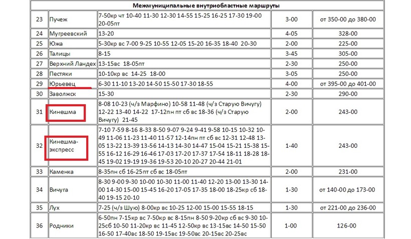 Автобусы в Кинешму ездят с 7 утра до 9 вечера каждые 15 минут. Есть автобусы в Кинешму с промежуточными остановками, есть экспрессы. Также для проезда подойдут рейсы в Юрьевец. Время в пути от 1 часа 45 минут до 2 часов 20 минут.Все автобусы прибывают на автостанцию (ул. Островского, д. 33).