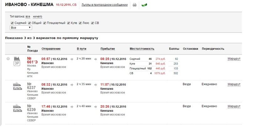 - Пассажирский поезд №661Э Москва-Кинешма. Отправляется в 5:57 и прибывает в 8:25.