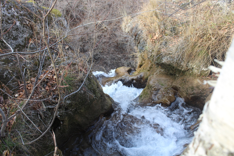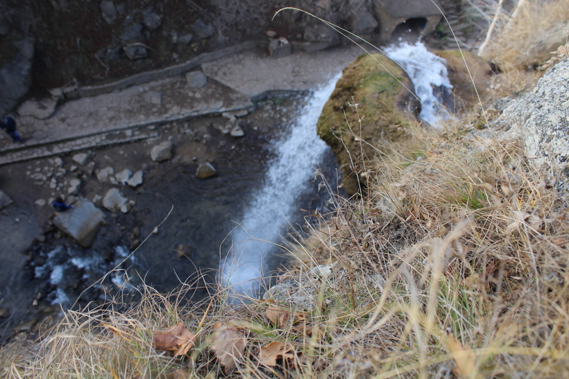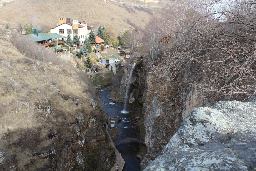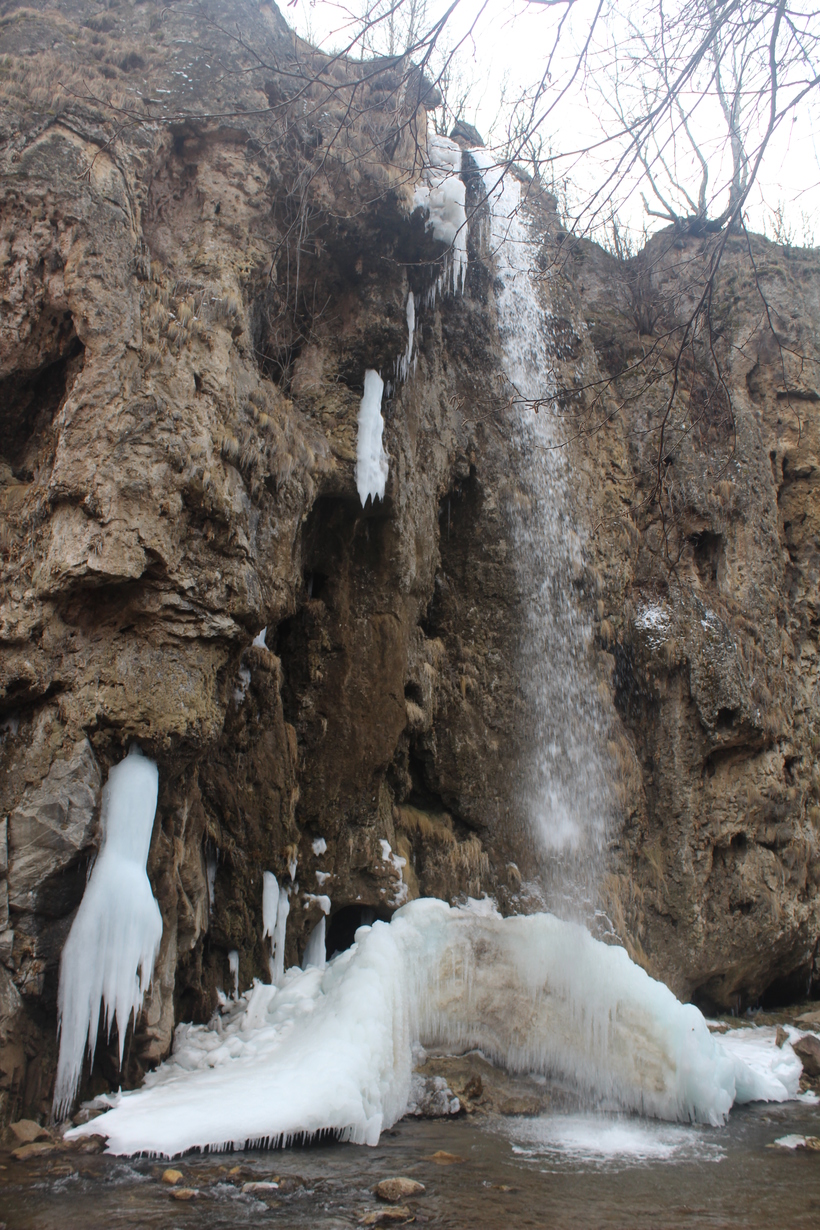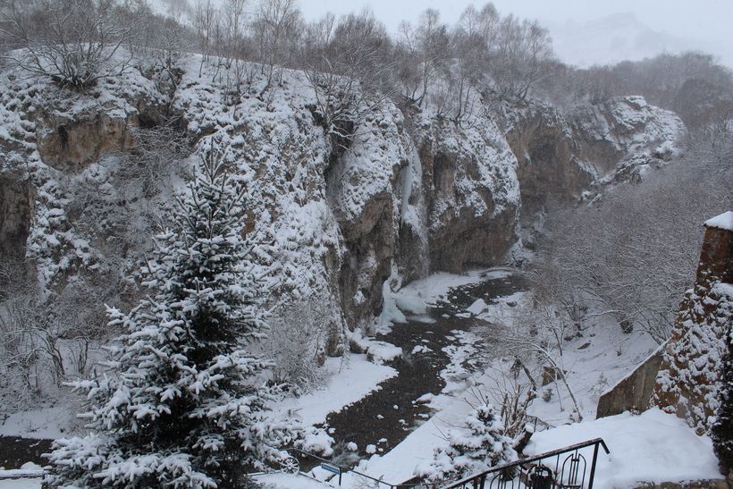Зимой разлетающиеся струйки, замерзая на стене ущелья, образуют причудливые ледяные наплывы и натеки.