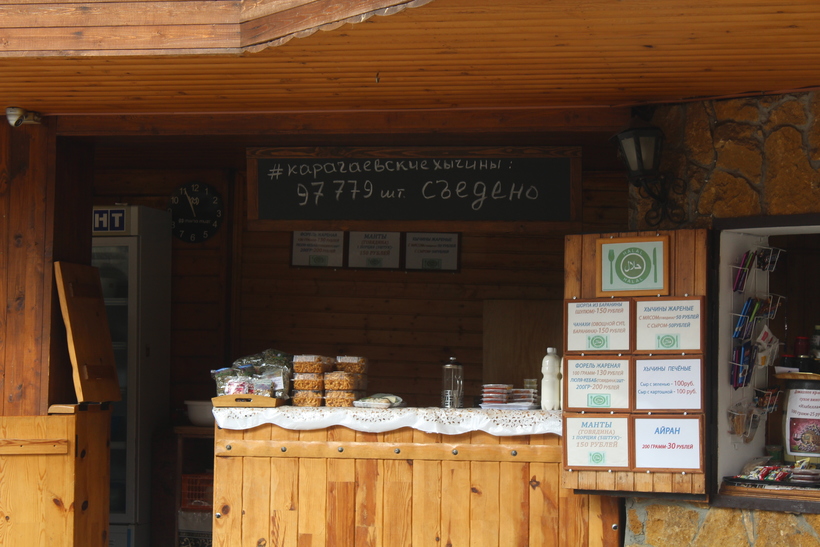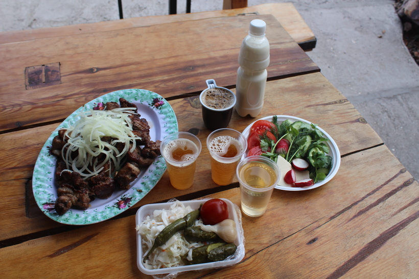 Уехать с Медовых водопадов и не поесть вкуснейшего шашлыка-преступление перед самим собой. Порция на одного конечно немаленькая, но это так вкусно, что лучше берите 3 шампура на двоих, не пожалеете. Великолепные хычины, соленья, сыр. Не забудьте айран, шашлык очень жирный и айран поможет пищеварению. Да, если Вы не за рулем, то попробуйте местное вино. Детям, да и взрослым, возьмите лимонад Груша с лисенком на этикетке. Один мой гость так описал местный шашлык "Как я буду рассказывать друзьям про это чудо? Сказать вкусно? Многие вещи вкусные. Сказать, что я его полюбил? Так слово люблю тоже подходит многому. Сказать, что шашлыка вкуснее я точно уже не попробую? Ну как объяснить, что зеленый это зеленый?!"