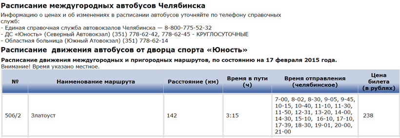 Расписание междугородних автобусов до Златоуста можно проверить на сайте челябинского автовокзала.