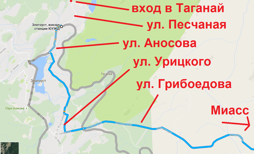 В Златоусте нам надо будет добраться до железнодорожного вокзала. Схема такая: въезжая в город со стороны Миасса, едем по улице Грибоедова до улицы Урицкого, поворачиваем направо и едем до улицы Аносова, где и располагается вокзал. От него будут указатели на посёлок «Магнитка». После вокзала Улица Аносова круто повернет налево. Надо будет свернуть с неё на ул. Песчаная вправо и доехать до большой туристической базы (здесь же располагается администрация парка). Если у вас есть навигатор, воспользуйтесь координатами GPS: 55.221214, 59.731699 (стоянка автомобилей у базы).