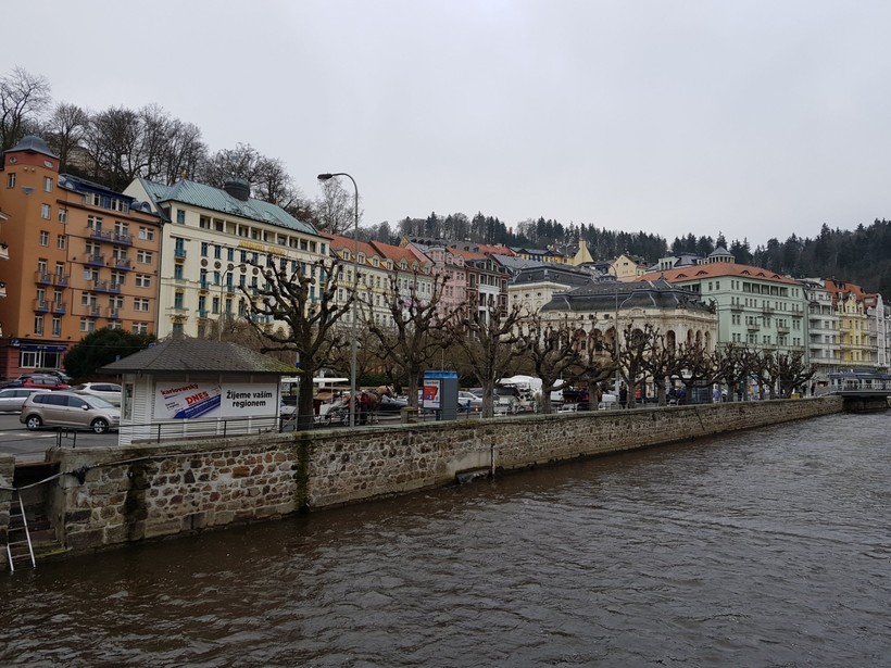 Апрельскую погоду в Карловых Варах чудесной не назовешь. Она мне напоминала скорее позднюю осень, чем середину весны. Довольно ветрено, без платка на шее чувствовала себя некомфортно. Часто случались дожди и туманы, хотя, справедливости ради, отмечу, что к концу месяца количество пасмурных дней заметно сократилось и все чаще выглядывало солнце.