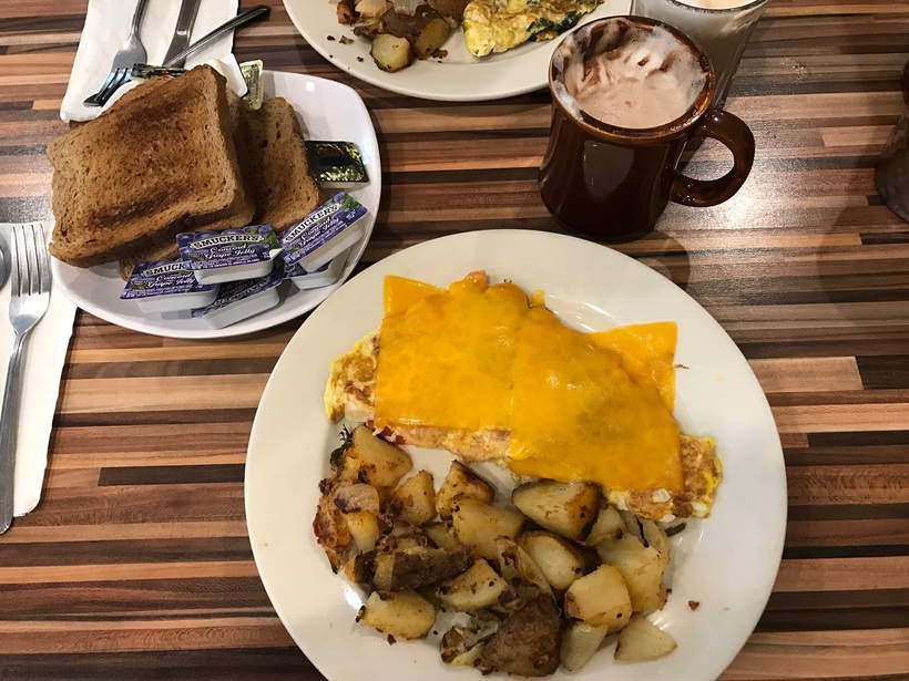 На завтрак в них можно получить стандартный американский завтрак - яйца в каком-то виде + 2 тоста с маслом и джемом + картошку. На двоих выходит порядка 30 долл (2 омлета + чай + кофе)
