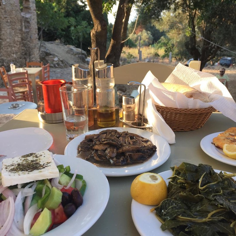Конечно, приезжая в Кос, я хотела посетить местную таверну и узнать больше о греческой кухне что-то еще, кроме мусаки. Формат греческих кухонь разительно отличается от привычного: это искренне радушное гостеприимство, принципиально свежие продукты для блюд, настоящее изысканное греческое вино. Именно значительность свежести выбора продуктов культивирует сезонность блюд. В октябре хорошо посещать рестораны с собственным производством продуктов. Так как к октябрю собирается урожай, изобилие винограда, овощей и оливок сказывается на цене и разнообразии предложенных блюд. Практически везде можно было расположиться прям на террасе или в саду.