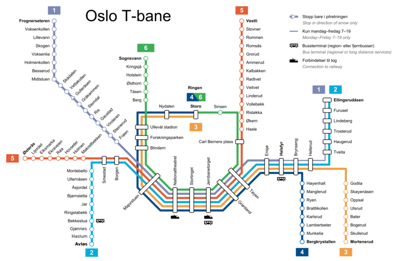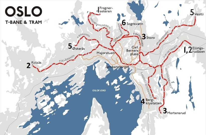 - Метро. Метрополитену Осло ( T-banen ) , конечно хвастать особо нечем, в метро Осло работают всего 6 небольших веток . Заглубление станций - минимальное, во многих местах вагоны метро идут по поверхности. Поезда маленькие, всего по несколько вагонов, в основном по 4 штуки. Расстояния между станциями, короткие от 3 до 5 минут.