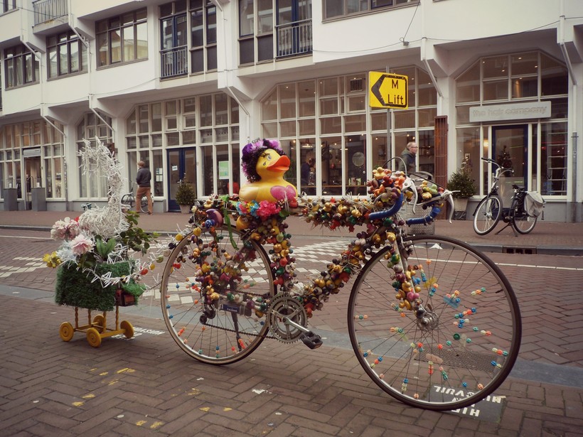 Фото на фоне огромных букв – банально. В нескольких минутах ходьбы от блошиного рынка, на пересечении Sint Antoniesbreestraat и Snoekjessteeg, катается на велосипеде очаровательная утка. Она произвела настоящий фурор, все спрашивают, где это я нашла такую птичку.