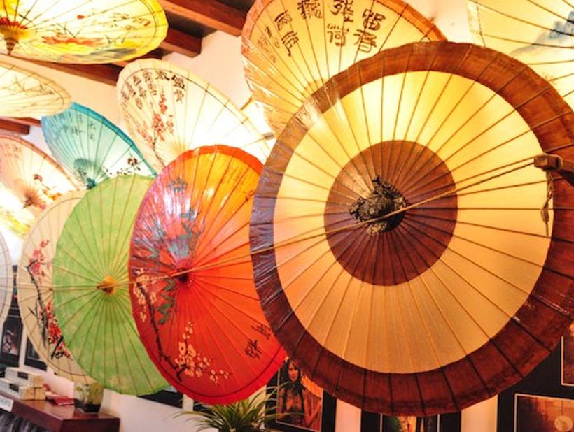 Тут отдают дань этой истории этого предмета быта и продают традиционные зонты – сделаные вручную из бамбука, дерева и вощенной бумаги по старинной технологии. Самое замечательное в них то, что они вполне пригодны к использованию по назначению – вощенная бумага выдерживает осадки. Так говорила мне консультантка, и я сама поначалу этому не верила, покупая зонт скорее как декорацию. Ну никак не может эта хрупкая ориентальная конструкция выдерживать петербургскую слякоть, и, тем не менее, это так. С этим зонтом и правда можно ходить под дождем и снегом. Под солнцем, кстати, с ним ходить мне не советовали, чтобы не выцветал его ярко-красный цвет.