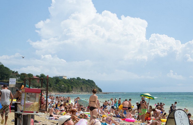 Наши люди по старинке предпочитают брать отпуска в летние месяцы, поэтому в мае не было такого количества отдыхающих. На второй день пришли на пляж в 10 утра, возможность выбора себе места по желанию, ещё оставалась. На солнце провели целый день, до 17 часов. Перегрева и солнечных ударов не получили и прекрасно загорели. Поразили люди на центральном пляже. Из-за того, что их не так много, каждый старался вести себя цивилизованно. Отсутствовала традиционная россыпь окурков и огрызков на пляже.