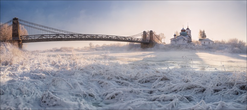 При подходе к мосту со стороны центра слева возвышается белокаменный Собор Троицы Живоначальной. На все январские праздники возле храма собираются люди, проходят праздничные службы, в чистом морозном воздухе переливами звонят колокола. На Крещение мы набрали именно здесь святой воды, которую разливают в емкости на улице. А с другой стороны моста - Никольская церковь 16 века. Поистине святое место!