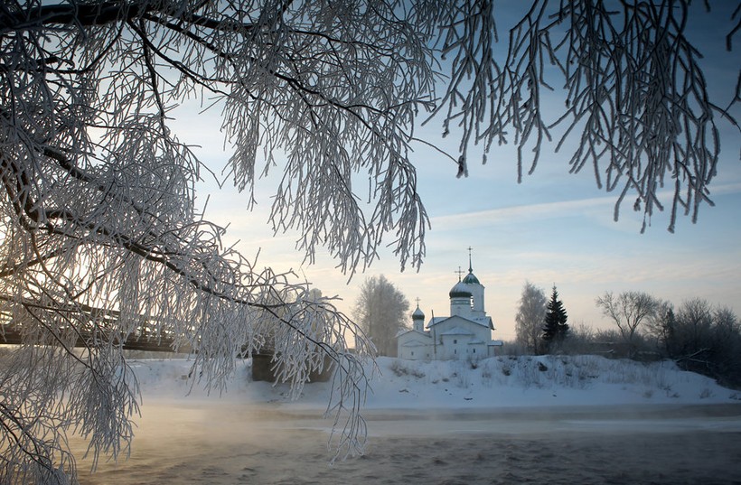 Может показаться удивительным, но при довольно низкой температуре ( -15-25) холод не особо ощущается. Ветер с ног не сбивает, наоборот, тихо. Ветер поднимается лишь изредка. Небо днем то чистое, как голубое стекло, то хмурое, покрыто снежными тучами. Чтобы ничего не пропустить и получить хорошие впечатления, надо потеплее одеться – и вперед! Остров находится примерно в 300-х километрах от Санкт-Петербурга, поэтому мы думали, что здесь сыро, большая влажность-ничего подобного, воздух будто хрустальный и звенящий. Как-то в течение трех дней мороз то крепчал, то началось таяние снега, снег на ветвях деревьев подтаял, а потом снова ударил мороз. Красота неописуемая, каждая ветка оделась в ледяной панцирь, и при малейшем дуновении ветра раздавался удивительный звук. Вечером при свете фонарей эти обледеневшие ветви выглядели еще великолепнее. Высокие берега реки с громким названием Великая надолго (на юге мы привыкли к таянию зимней красоты на следующий день) покрываются снегом, поэтому съезжать с таких горок хочется не только детям, но и взрослым, и совсем необязательно приобретать ледянку, можно и так! В это время на стадионе в Острове заливают каток, так что можно прокатиться и на коньках! Река Великая тоже замерзает и в это время точно соответствует своему названию, похожа на величественную барыню. Изумительный старорусский пейзаж открывается со знаменитого Северного цепного моста. В январе он тоже весь обледенелый и в снегу, поэтому, когда идешь по нему, чувствуешь себя приглашенной в какой-то древнерусский замок.