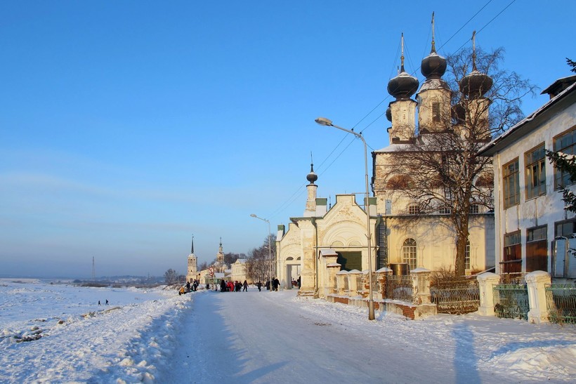 Великим Устюгом в феврале я была очарована. Город полон развалившихся деревянных особняков и аккуратных церковных луковок. Впечатлил храмовый комплекс, где я увидела древние стены, местами пошарпанные, с обнажившейся кирпичной кладкой, с бесконечными ходами-выходами-лабиринтами.