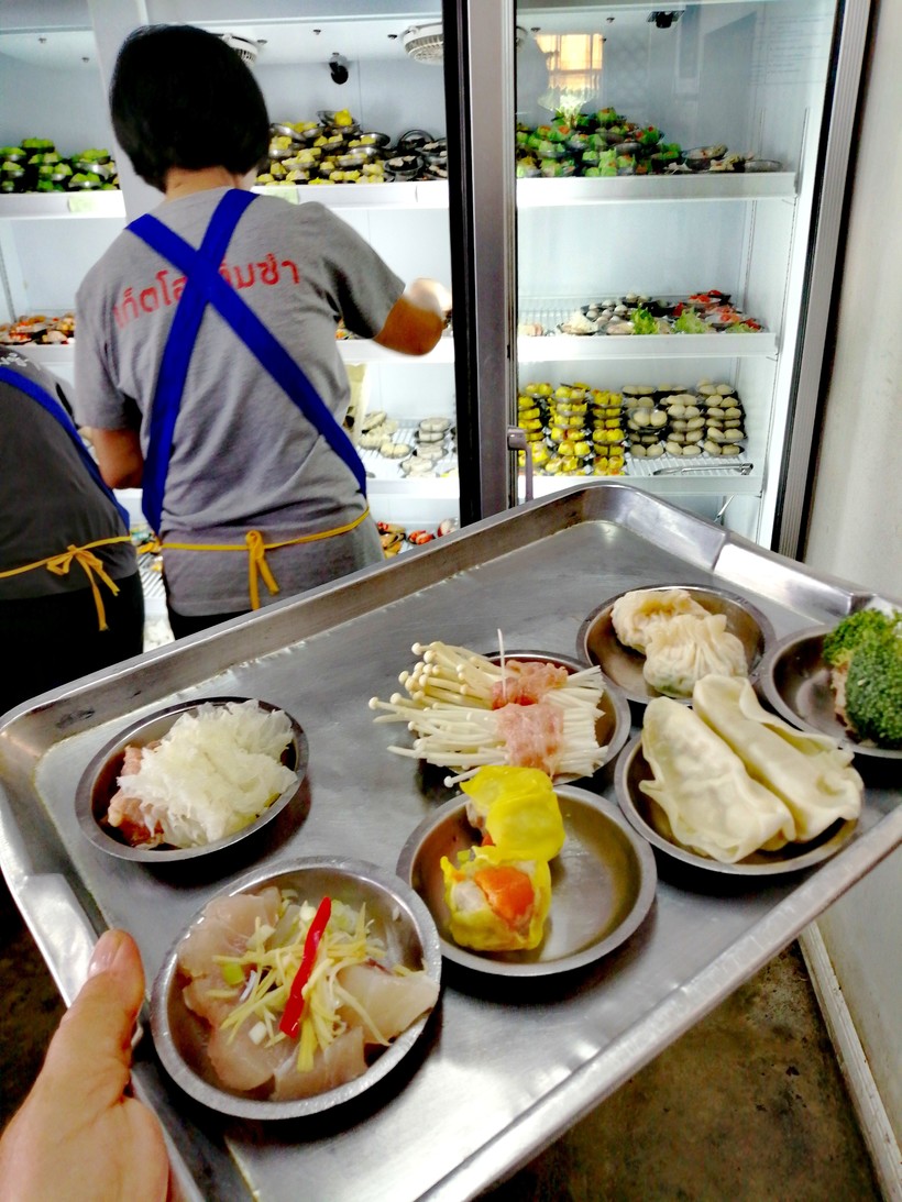 Здесь вам поможет распорядитель, который предложит вам свободный столик и принесёт небольшой чайник со свежезаваренным чаем из жасмина. За чай платить не надо. Затем вы проходите к громадному холодильнику, который стоит недалеко от входа и самостоятельно выбираете блюда.