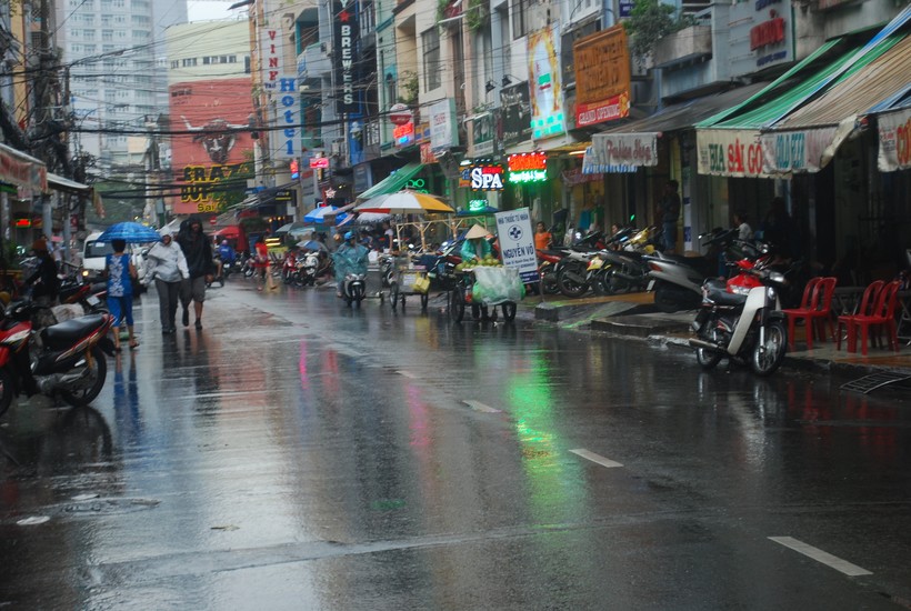 Как известно, июнь во Вьетнаме приходится на разгар сезона дождей. Погода стояла очень влажная и жаркая. Выходя на улицу, казалось, что ты в бане, настолько было душно. Температура воздуха частенько превышала 35 градусов. Ночью столбик термометра опускался до 24 градусов, но прохлады и свежести не ощущалось. Температура воды была около 27 градусов, однако самое приличное место, где можно купаться, находится аж в 100 километрах от города. Дожди шли почти каждый день, чаще в вечерние часы. Поэтому отправляясь в Хошимин в июне сразу запаситесь дождевиками, зонтики здесь не помогут. Влажность просто огромная, вымокшая под дождем одежда не успевала просыхать даже за двое суток. Чтобы упростить задачу, можно взять с собой веревку и натянуть ее в номере под кондиционером, тогда процесс сушки пойдет значительно быстрее.