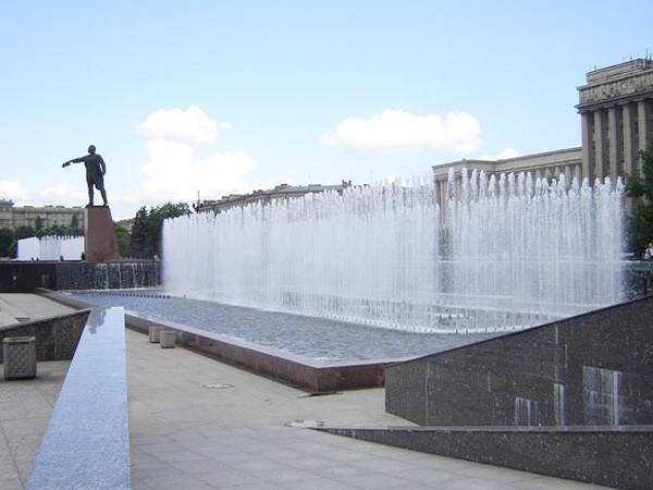 Поющие фонтаны на Московской площади. Это очень красивые фонтаны, большие. Вечером включают подсветку. Работают фонтаны в теплое время года, но ночь их выключают.