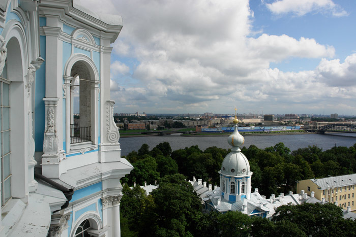 Также отличными смотровыми площадками могут стать соборы. Например, звонница Смольного собора. Ее высота - 50 метров. Правда вход на нее платный - 100 рублей, но зато вид отличный.