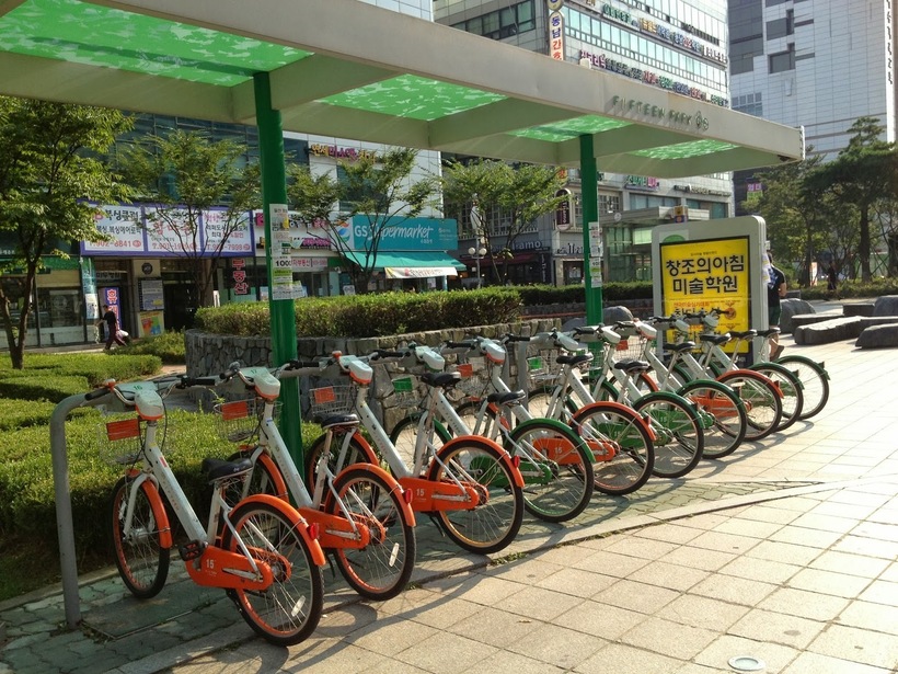 В Сеуле можно арендовать велосипед (причем есть места с бесплатной арендой), думаю это можно поискать по запросуarticle free bicyle rentalsseoul. Суть в том, что вы берете велосипед на условиях таких как, либо зарегистрироваться на сайте, либо указать свои паспортные данные или студенческие данные. И можете взять велосипед на 1 день, или пару часов - бесплатно. И вам говорят места, куда вы можете сдать этот велосипед.