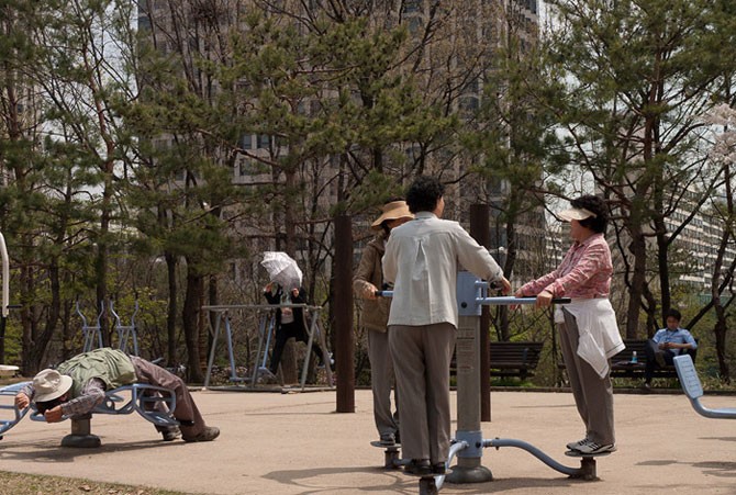Азиатские парки отличаются от российских. Если у нас в России мы любуемся красивыми растениями, гуляем с детьми и сидим на лавочках, то в Корее в парках люди усиленно занимаются спортом и поддерживают здоровый образ жизни. Видимо поэтому они и живут очень долго. (надо у них этому поучится)