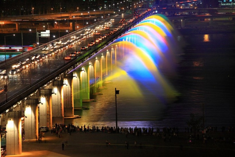 - Еще одно красивое место в Сеуле это Мост Фонтан Радуги. Посмотреть его стоит как и утром так и вечером. В отличии от обычных фонтанов бьющих вверх, струи воды направлены прямо и вниз что создает великолепной красоты картину. Этот мост фонтан занесен в книгу рекордов Гиннеса. Двигаемся из Seoul Station по голубой ветке до Ichon, там пересаживаемся на бирюзовую ветку и едем до Seobinggo. Выходим, идем к реке и смотрим на прекрасный мост фонтан.