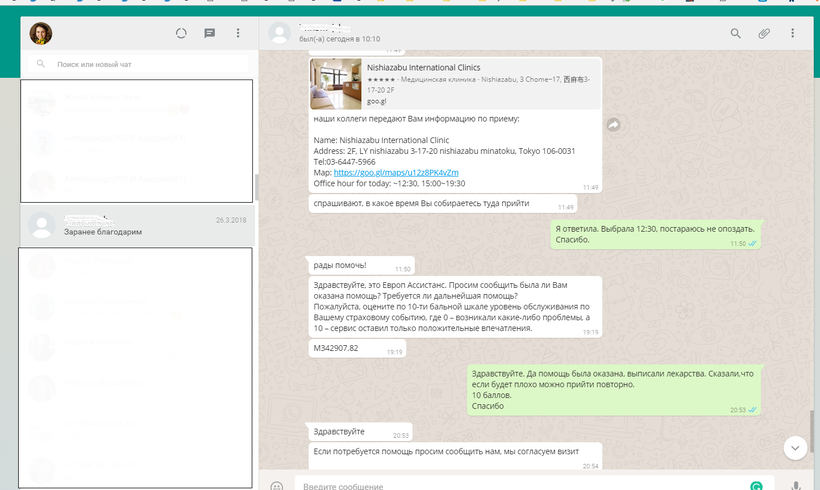 Общение со страхователем происходило в what's app. По инструкции от страхователя мне нужно было выслать фотографии с загран.паспортом, где есть разворот с моими персональными данными, номером паспорта и фото, и разворот где стоит печать с датой о въезде в Японию. Потом в течение 30 минут мы уже согласовали место, и время приема. И мы с мужем поехали в поликлинику.