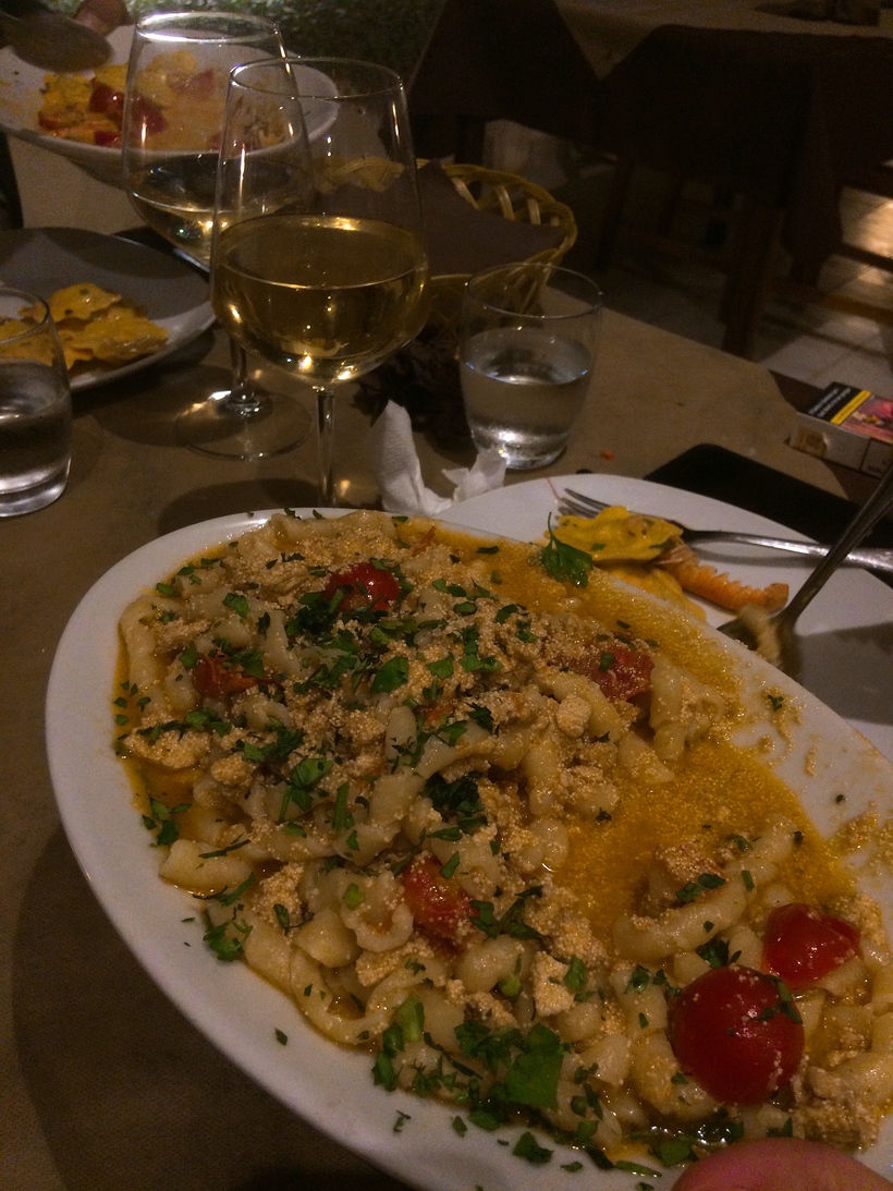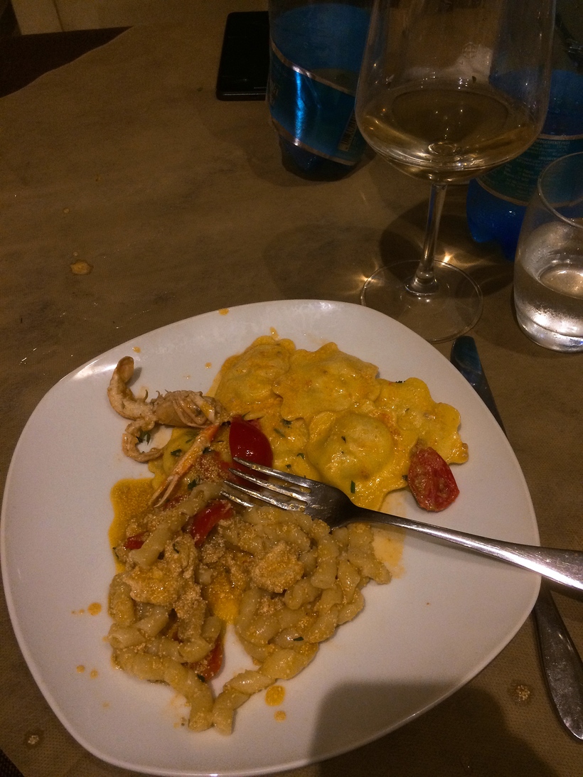 Город не особо туристический, поэтому здесь не проблема найти хорошее место, где поужинать или пообедать. Стандартно предложение ужина за 15 евро включает в себя антипасту+основное блюдо+десерт и бокал вина. Готовят очень вкусно.