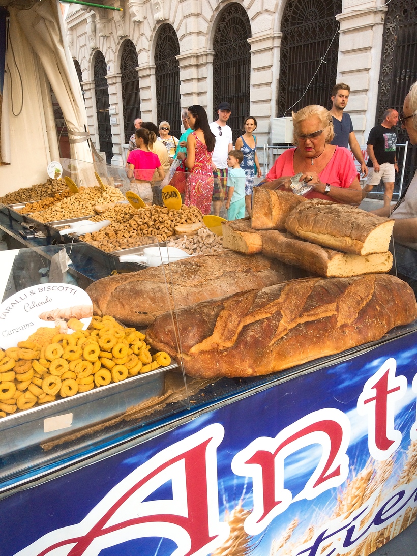 Я бы хотела рассказать о маркете, который проходит на выходных в центре Триеста. Тут вы можете отведать сосиски, квашеную капусту, крендели как дань австрийской традиции, а также попробовать как сицилийский фаст-фуд оранчино, так и морепродукты.