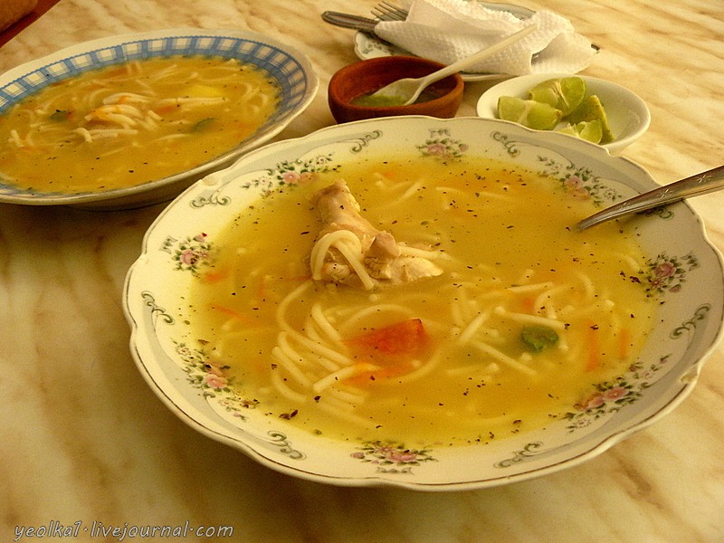 Обед, конечно, тоже можно получить самый разнообразный. Но если хочется аутентичности, можно пойти на чуть более отдаленные улицы в поисках вывески или объявления со словом almuerzo. Альмуерзо - это такой домашний бизнес-ланч, в который входит огромная тарелка супа (куриного бульона, макаронного или овощного супа) и такая же огромная тарелка со вторым: вам подадут кусок мяса с рисом и небольшим салатом. Иногда за отдельную плату, а иногда за указанную стоимость, в обед входит напиток, компот или местная газировка, мало чем отличающаяся от нашего буратино.
