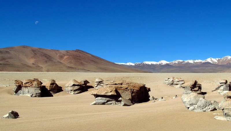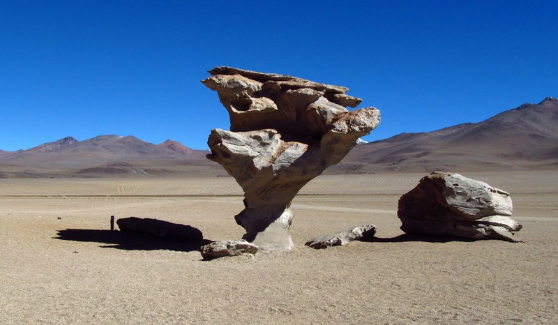 Продвигаемся дальше по высокогорью. Альтиплано – это второе по величине горное плато на планете после Тибета. Высокогорная равнина и два хребта Анд, вдоль которых она вытянулась, образовались в результате столкновения плит Тихого океана и Южно-Американского континента. Ближе к южной оконечности Альтиплано, близ границ Боливии, Чили и Аргентины, видны вулканы с неровными краями кратеров. Водителя можно просить останавливаться для фото на фоне вулканов где угодно, но он сам будет делать остановки в самых красивых местах: у вулканических камней, образовавших причудливые формы, у каменных деревьев, появившихся в ходе эрозии и у смотровых площадок, с которых открываются сумасшедшие виды.
