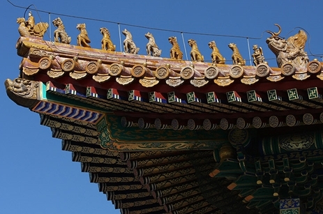 Цвет в Китайской архитектуре также играет важную роль. Черепица глазуровалась в соответствии с назначением постройки, статуса, символики и идеи, которая должна быть воплощена. Цвета, которые можно увидеть на черепице: зелёный, терракотовый, красный, золотой и желтый. Последние два цвета использовались в императорских постройках. Покрытие черепицей создаёт волнообразный эффект, за счёт геометрии каждой отдельной детали.