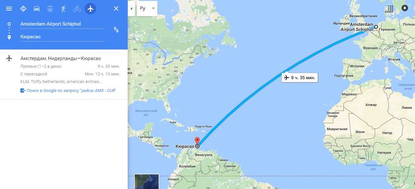 - AMS Амстердам (Схипхол; 10:00 вылет) - CUR Кюрасао (самый большой остров Нидерландских Антил; 13:35 посадка); 3 ч. 35 мин. полёт.