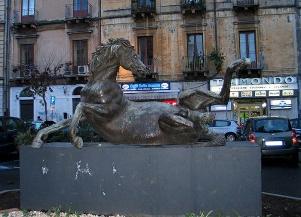Эта конная скульптура Cavallo caduto ("Упавшего коня") - работа архитектора Франческо Мессины -находящаяся в сицилийском городе Катания, не раз вызывала возмущение прохожих. Тем более, что сицилийцы - весьма набожный народ Неоднократно предпринимались попытки "приодеть" статую - готовясь к религиозному празднику в честь Мадонны, блюстители нравственности выковали самые настоящие железные трусы и нацепили их на статую. Теперь «подгузник» красуется в районе хвоста животного.