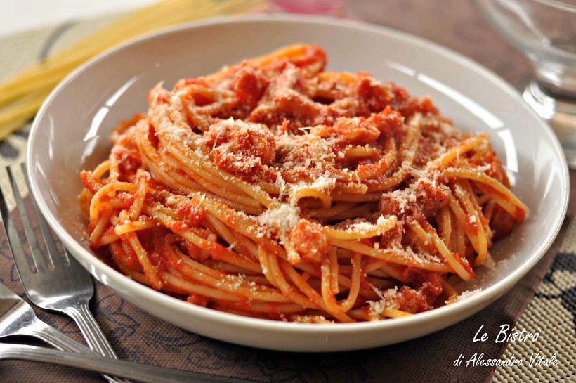 - Спагетти алл'аматричана (Spaghetti all’amatriciana) – традиционные спагетти с соусом на основе томатов и гуанчале (особая итальянская разновидность бекона). Рецепт был изобретен в городе Аматриче в XVIII веке.