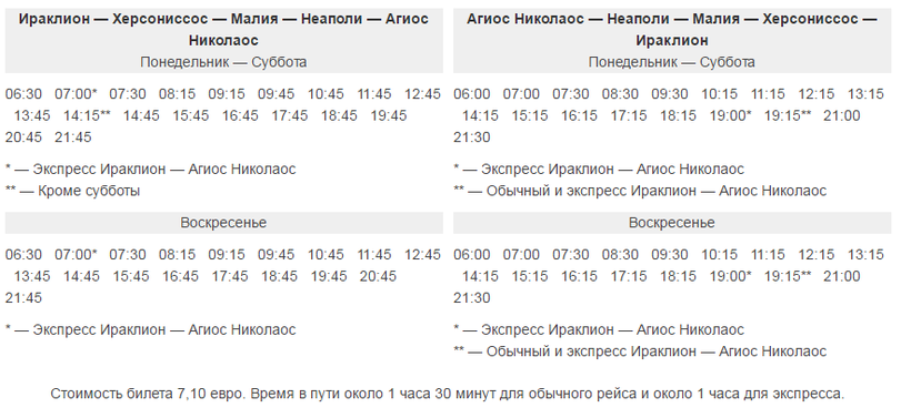 Из Ираклиона в Агиос Николаос автобусы отправляются примерно каждые полчаса. Первый автобус отправляется в 06.30, последний – в 21.45. По воскресеньям автобусы ездят реже, примерно раз в час.
