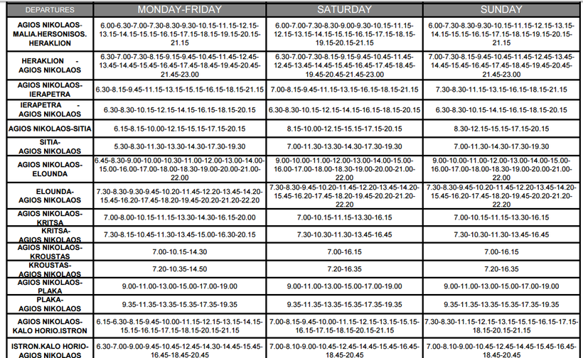 Первый автобус в Иерапетру выезжает в 06.30 утра, последний – в 21.15. По субботам и воскресеньям первый автобус в Иерапетру выезжает в 07.00. Ниже приведено расписание всех междугородних автобусов, курсирующих по Криту.