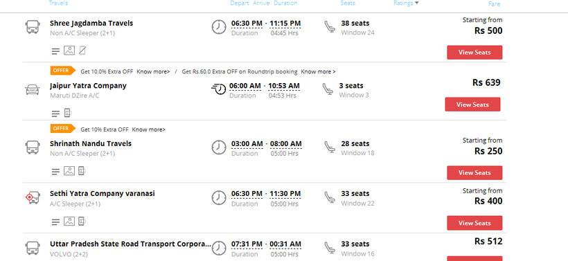 Ниже приведена информация о том, сколько часов вам потребуется, чтобы добраться от Джайпура до Агры, а также приведена примерная стоимость проезда (средняя цена билета) на том или ином виде транспорта.