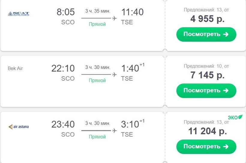 Проездные документы на самолет обойдутся от 4955 рублей (от 29050 тенге). По данному маршруту летают самолеты компаний: Scat Airlines, Bek Air и Air Astana.