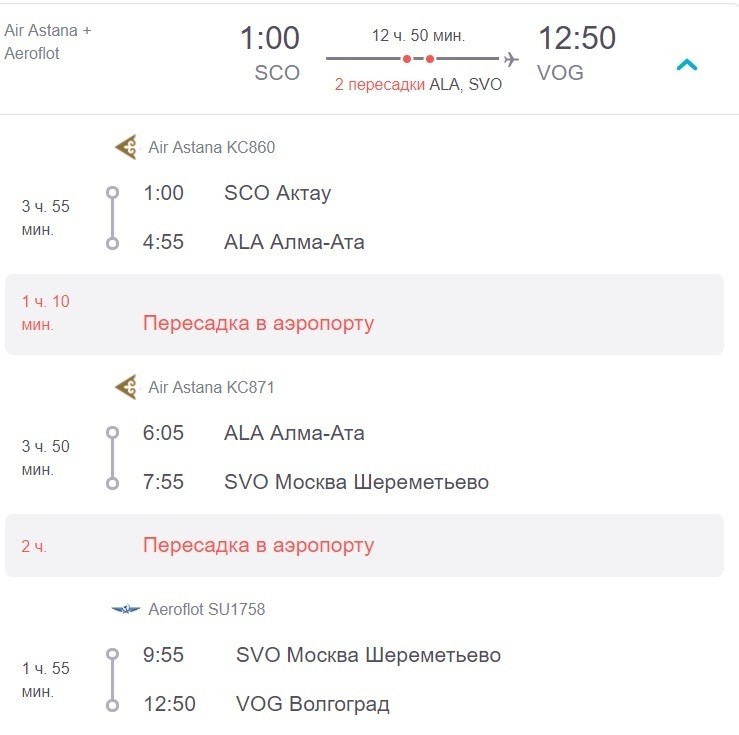 К сожалению, рейсы с одной пересадкой есть не во все дни. На скриншоте я вам показала пример перелета с двумя пересадками. Самолеты принадлежат компаниям Air Astana и Aeroflot.