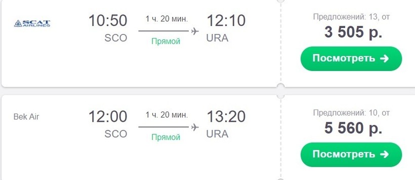 Гражданские авиаперевозки из Актау в Уральск осуществляют компании Scat Airlines и Bek Air.
