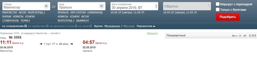 Поезд до Уральска ходит один раз в два дня. Актуальное расписание смотрите на скриншоте. Весь путь займет более 1,5 суток.