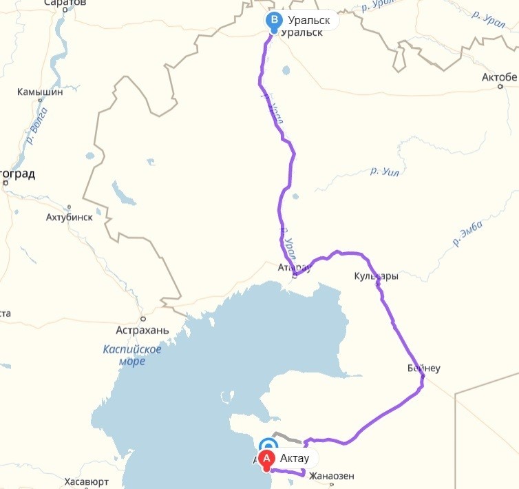 Между этими населенными пунктами примерно 1400 километров по трассе. С одной остановкой на ночлег до Уральска можно добраться за двое суток. Устроить себе длительный отдых лучше всего в Атырау. Номер в приличной гостинице здесь стоит примерно 10000 тенге (1700 рублей). Как можно проехать в Уральск, я обозначила на карте.