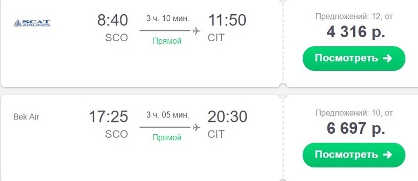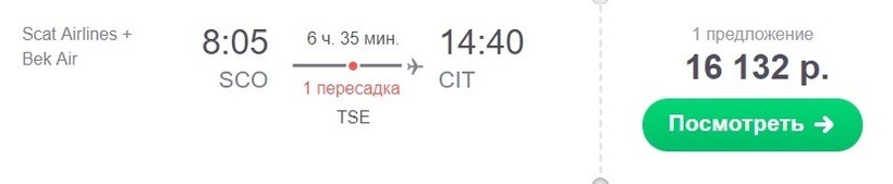 Полет продлится три часа. Авиаперевозки по данному маршруту осуществляют компании: Scat Airlines, Bek Air.