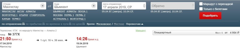Его приобретайте заранее в кассе на ж/д станции. Расписание я всегда смотрю либо на сайте «Российские железные дороги», там удобный интерфейс, либо на официальном сайте«Казахстан темир жолы» (здесь электронные билеты не продаются).