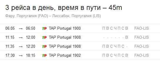 Ежедневно между столицей провинции Фаро и Лиссабоном совершается три авиарейса. Перевозку осуществляет португальская компания TAP Portugal. Вылеты осуществляются в 06.05, 11.35 (по воскресеньям – 11.15), 17.30. Перелет длится 45 минут.