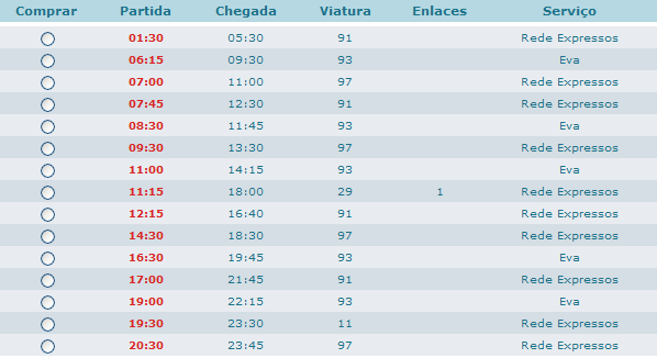 Между городами ежедневно курсируют автобусы двух перевозчиков: Rede Expressos и Eva. Рейсы осуществляются едва ли не круглосуточно – первый автобус выезжает в 01.30, последний – 20.30.