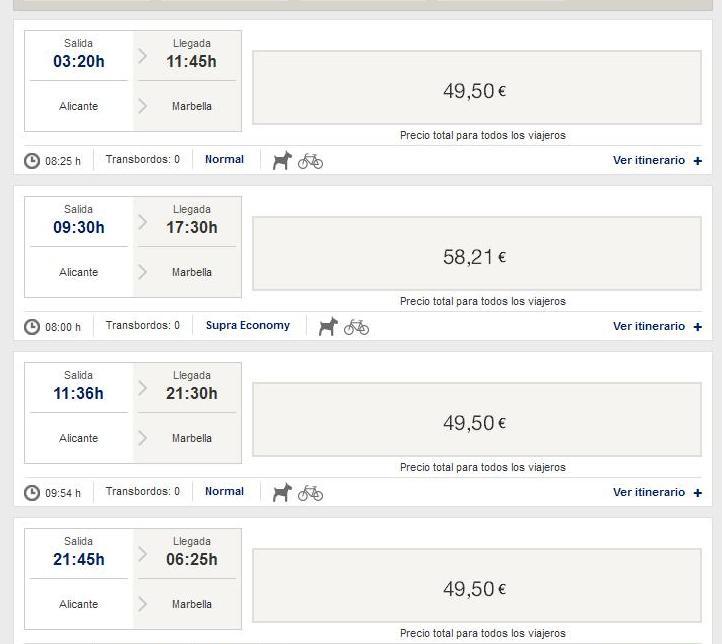 Из Аликанте в Марбелью билет стоит в среднем 50-58 евро.