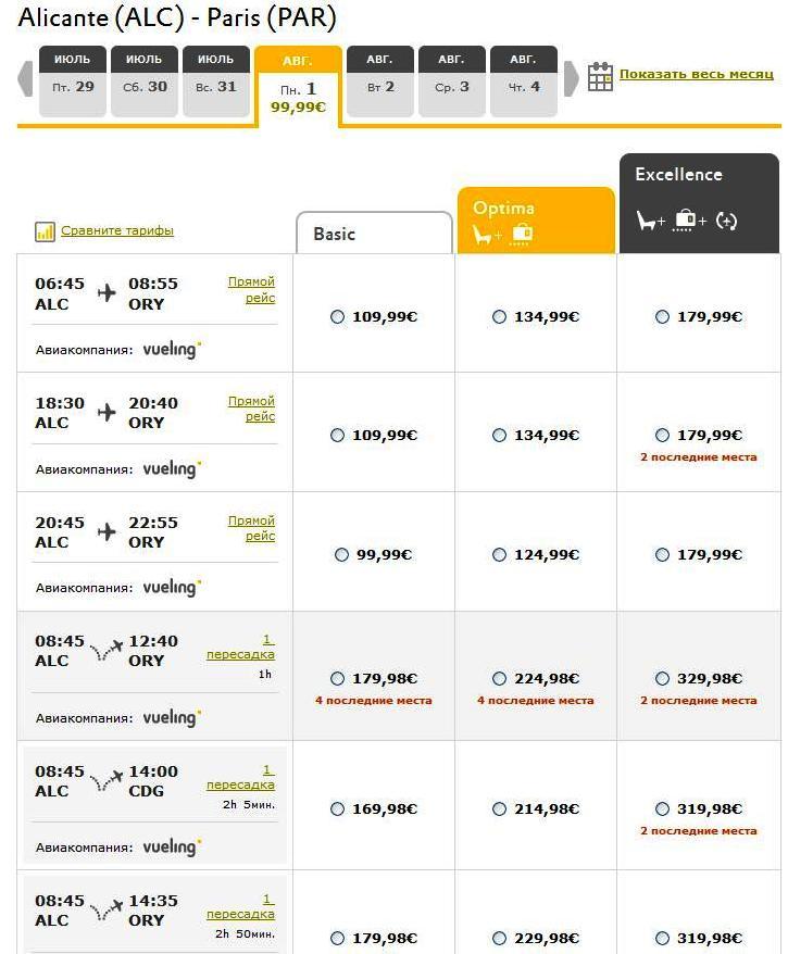 Авиакомпания Vueling Airlines совершает утренние рейсы ежедневно с 23 мая про 30 октября. Вылет из Аликанте в 6.45 утра. В Париже вы будете уже в 8.55. Вечерние рейсы с вылетом в 18.30 так же совершаются этой авиакомпанией в период с мая по декабрь ежедневно. В 14.55 рейсы Vueling Airlines отправляются каждый день, за исключением четверга и пятницы. Самолеты приземляются в Париже в аэропорту Орли.