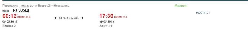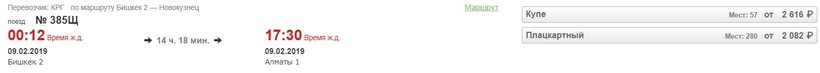 385Щ Бишкек → Алматы → Новокузнецк, который отправляется с железнодорожной станции Бишкек-2, что расположен по адресу - бул. Эркиндик, д 1 / а, в 22.50 и прибывает на железнодорожный вокзал Алма-Ата-1.
