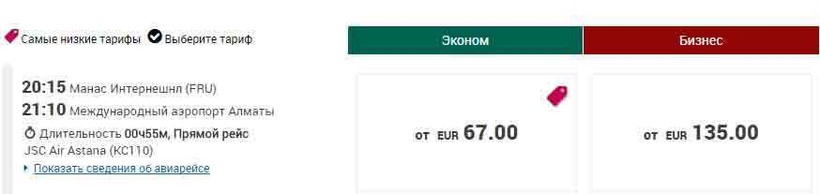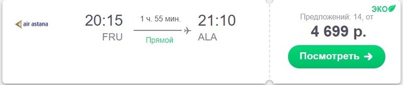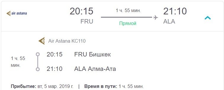 Авиа рейс KC 110 улетает из аэропорта Бишкек (Манас) в 19.55 и прилетает в аэропорт Алматы в 20.45.